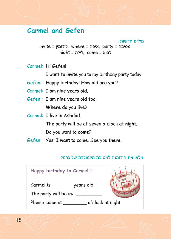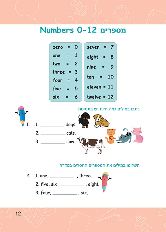 המשך הרחבת אוצר המילים, מספרים עד 100, קריאת שעון, ימי השבוע, כללי דקדוק בסיסיים, הבנת הנקרא ועוד.