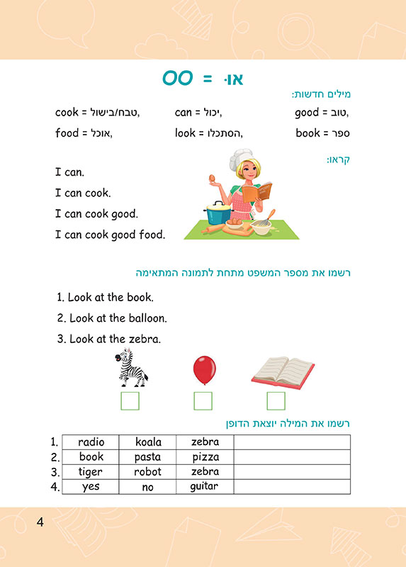 לימוד האותיות וכתיבה נכונה, לימוד אוצר מילים בסיסי, לימוד שילובי אותיות והבנת הנקרא.